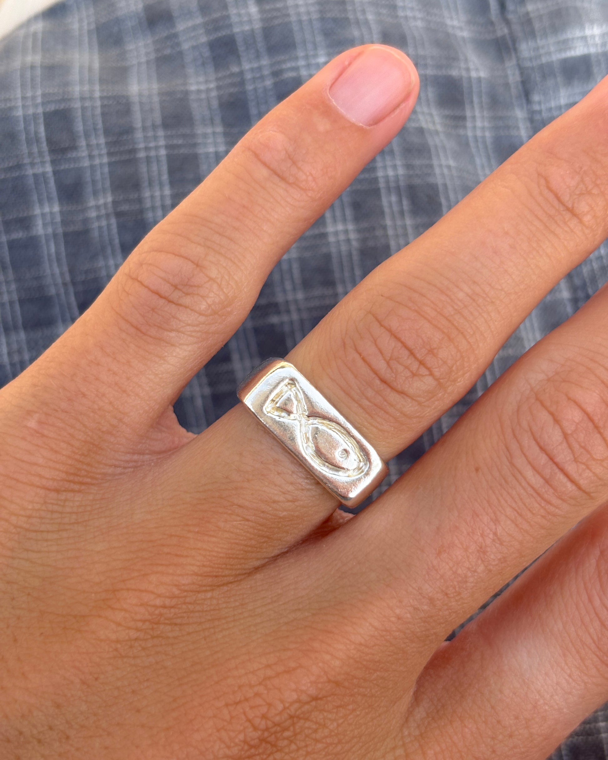 Solid sterling silver signet with a hand engraved fish.