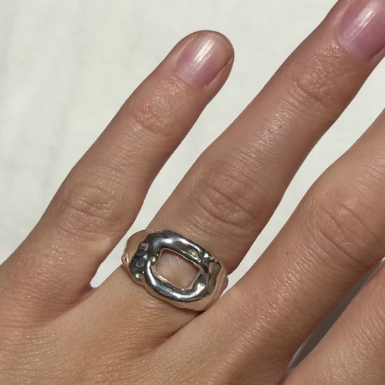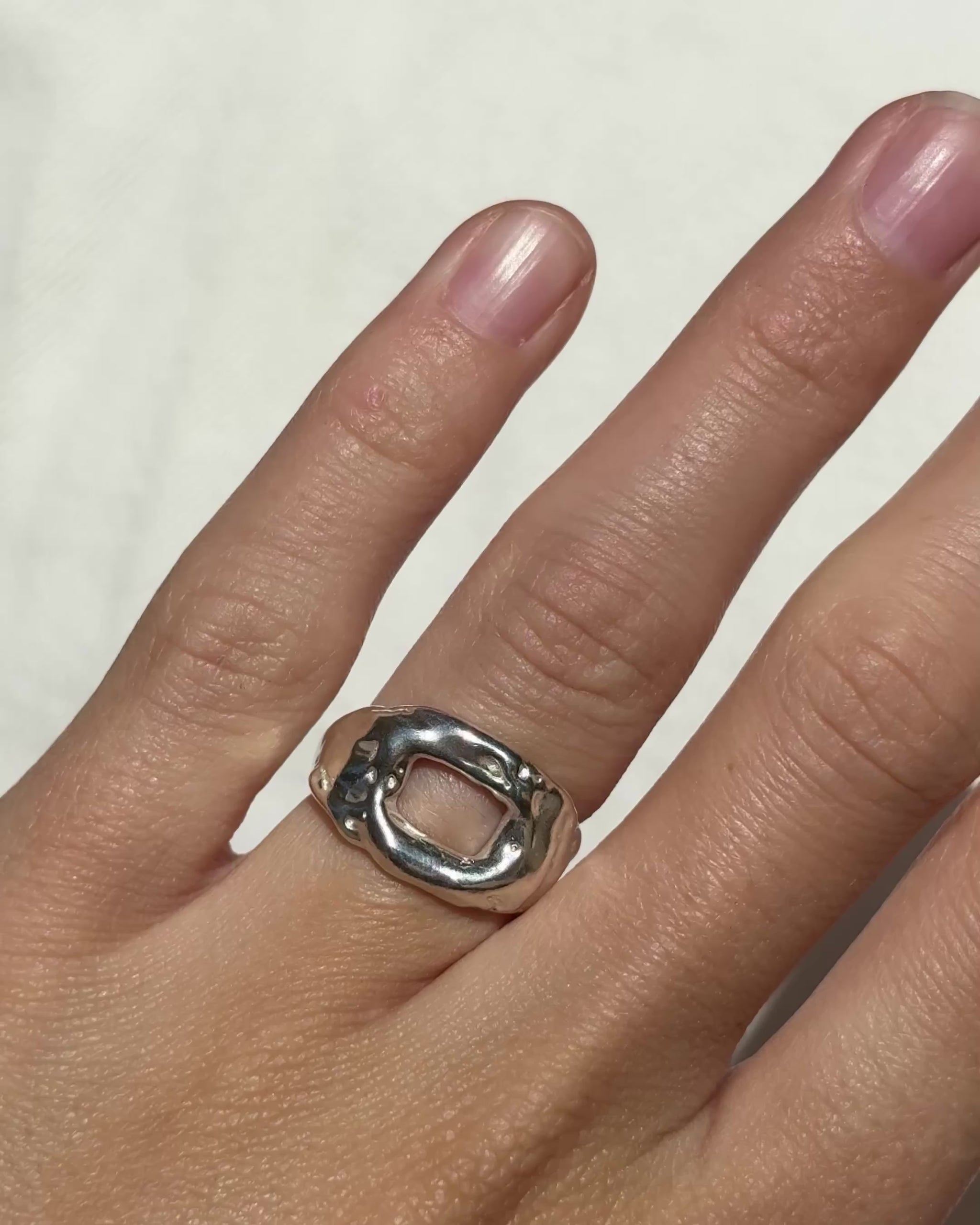 This hand carved sterling silver ring features and organic shape with a rectangular opening.