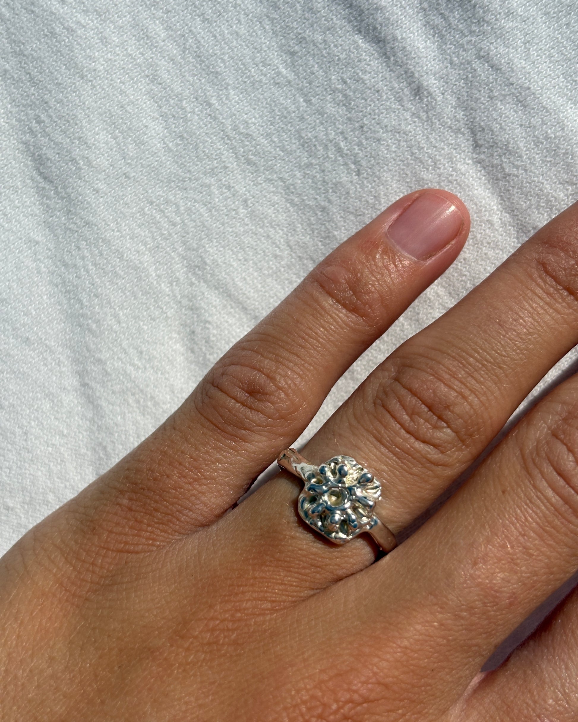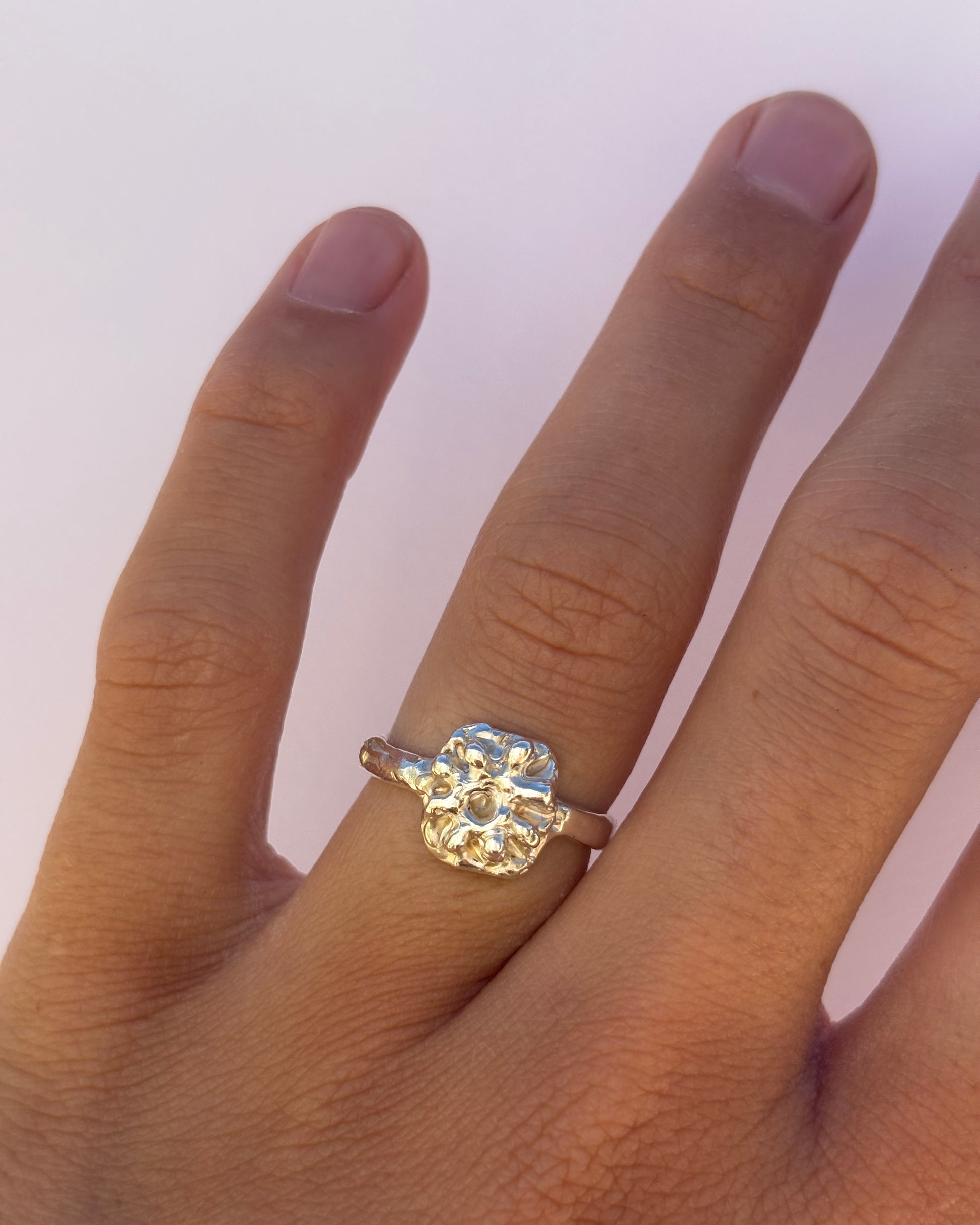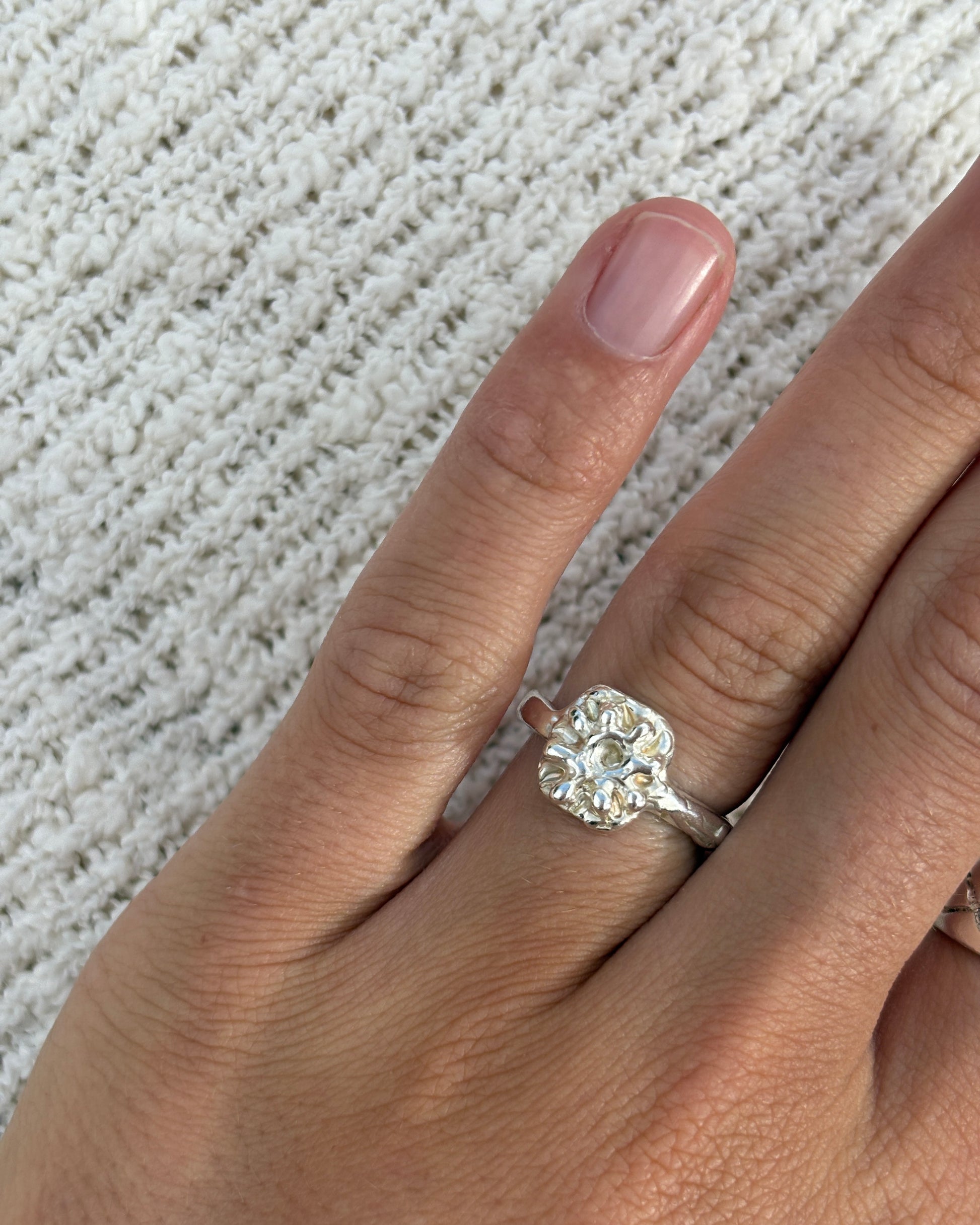 The Seabloom signet is a handcarved organic sterling silver signet, inspired by ocean flora.