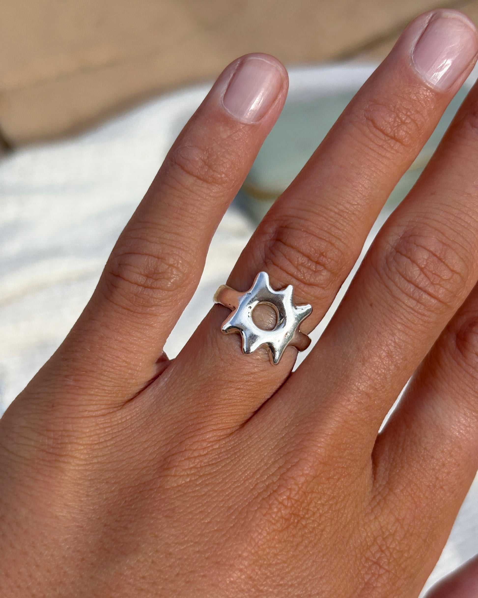 The Sunburst Ring is a chunky, handmade sterling silver ring symbolising the sun